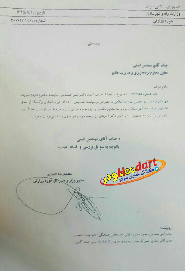 تذکر دکتر امیرحسنخانی به وزیر راه و شهرسازی در مورد مسیر فردوس - دیهوک و وزیر بهداشت و درمان و آموزش پزشکی در خصوص نصب دستگاه سی تی اسکن در شهرستانهای فردوس و طبس1396/11/25