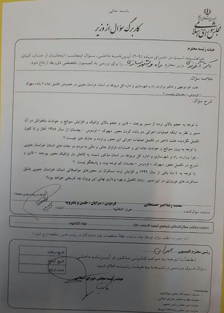 سوال کتبی دکتر امیرحسنخانی از وزیر راه و شهرسازی در خصوص کم توجهی در خصوص تکمیل باند دوم دیهوک-فردوس-بجستان