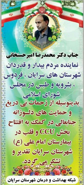 تشکر و قدردانی سرکار خانم دکتر شرفی ریاست شبکه بهداشت ودرمان سرایان از دکتر امیرحسنخانی بابت پیگیری راه اندازی بخش قلب بیمارستان امام علی (ع) سرایان